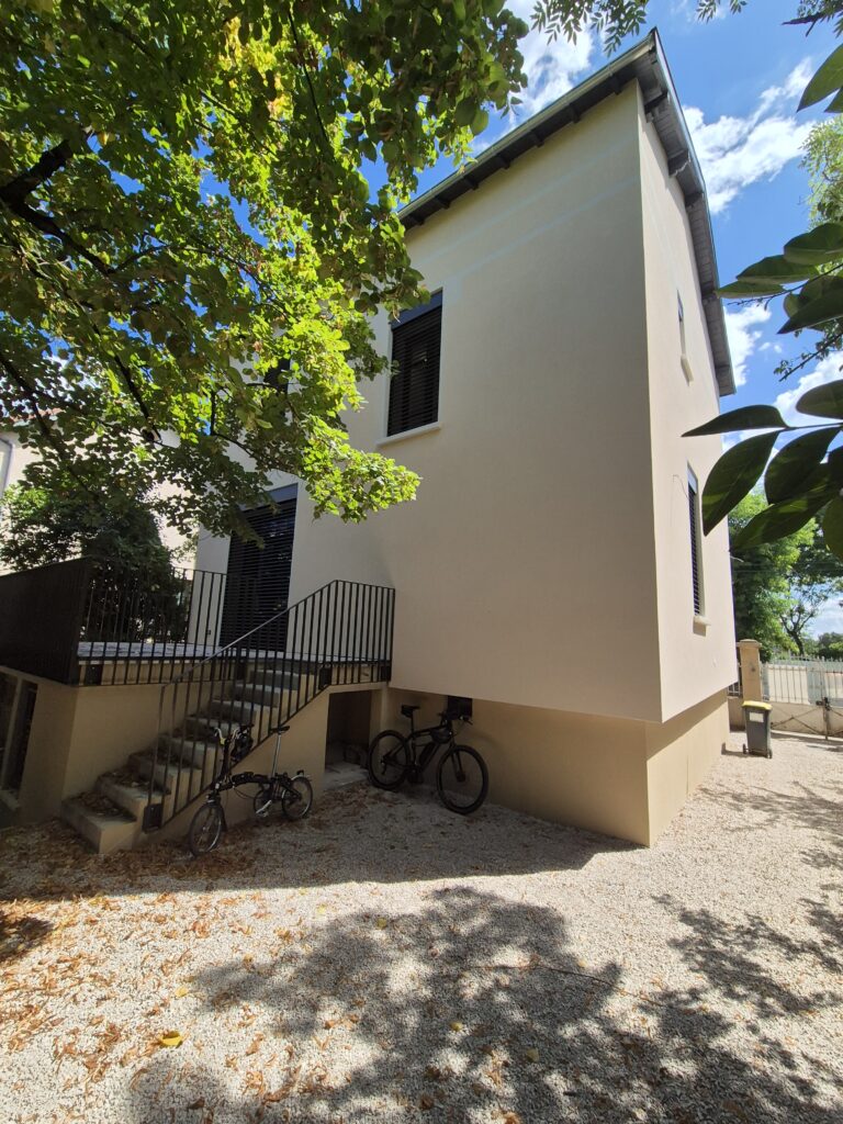 Cette maison pleine de charme nécessitait un gros travail de rénovation énergétique et fonctionnel. Pour cela, nous avons opté pour une ITE en fibre de bois, avec des menuiseries alu-bois. Concernant la fonctionnalité, l’espace de vie a été repensé en déplaçant l’entrée et décloisonnant le RDC.